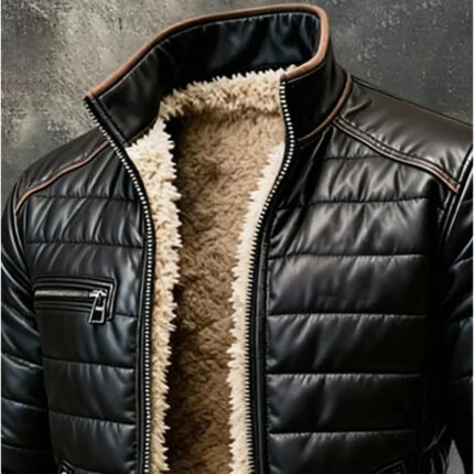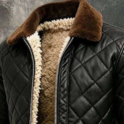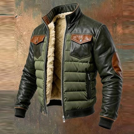 Men’s Retro Leather Quilted Patchwork Warm Zipper Outdoor Jacket