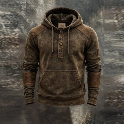 Men’s Vintage Distressed Leather Panel Hooded Sweatshirt