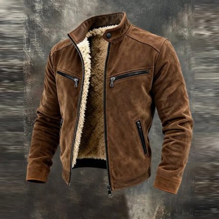 Men’s Retro Suede Patchwork Fleece Lined Warm Outdoor Zip-Up Jacket