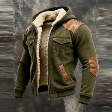 Men’s Retro Corduroy and Leather Patchwork Multi-Pocket Fleece-Lined Outdoor Jacket