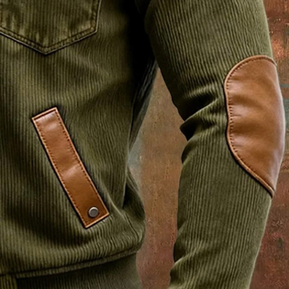 Men’s Retro Corduroy and Leather Patchwork Multi-Pocket Fleece-Lined Outdoor Jacket