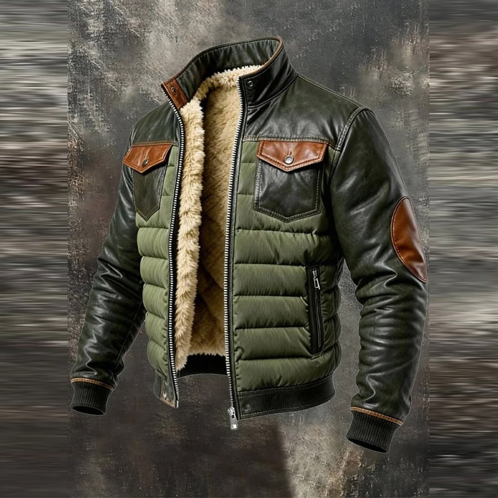 Men’s Retro Leather Quilted Patchwork Warm Zipper Outdoor Jacket